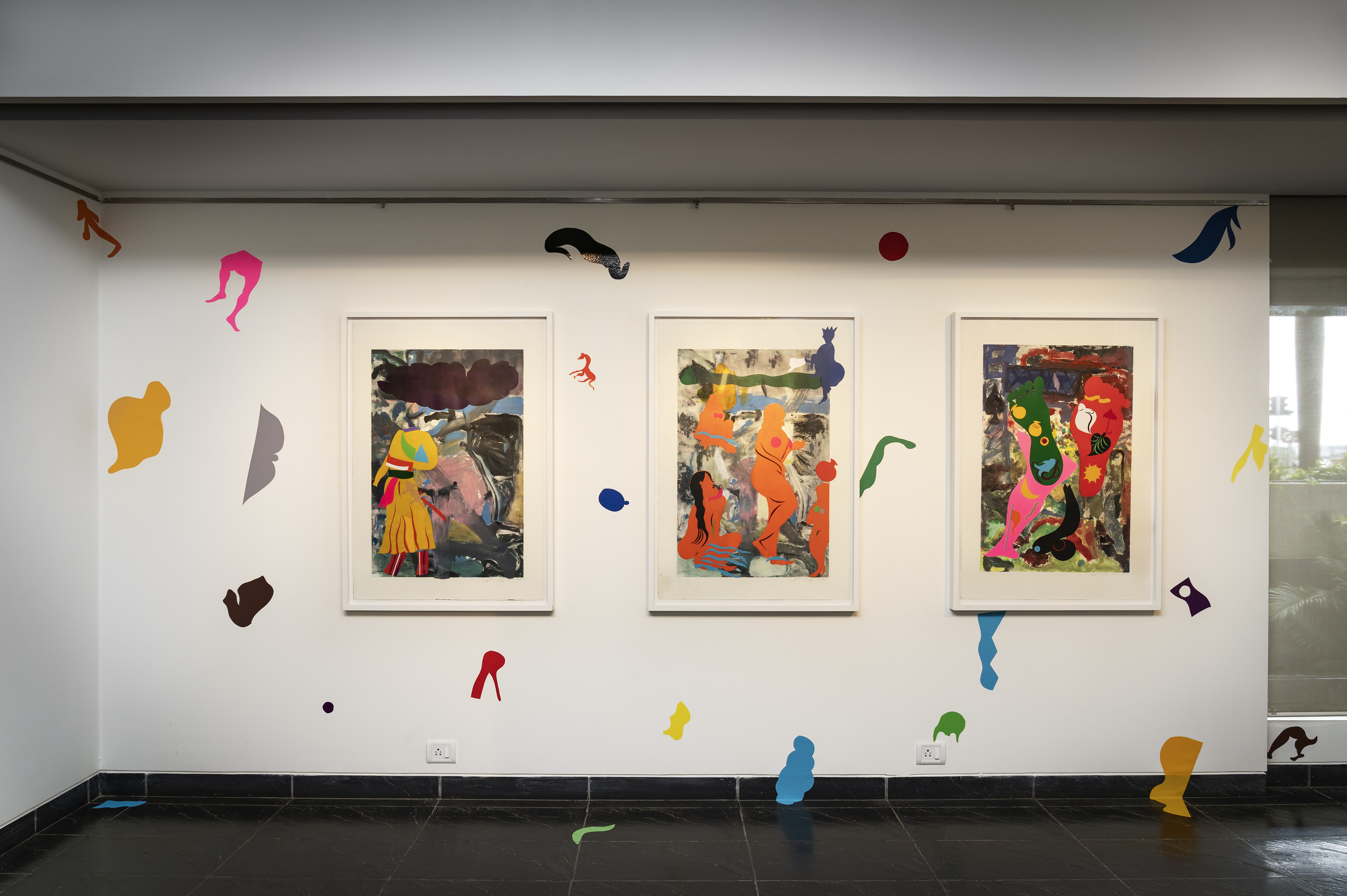 Raz and Mithani capitalise on a bold colour palette and processes of layering to produce a body of work that might be two-dimensional in nature, yet evokes a sense of fluidity and momentum. On one hand Mithani stylistically revives motifs and tales through representation, his body of work can be read like leaflets of a book where narratives come alive. On the other hand, Raz rejects narratives and playfully toys with semiotics, leaving hidden meanings, metaphors and symbols through her work. Familiar visual associations with 'traditional India' boomerang in front of us, but will we be able to place them?