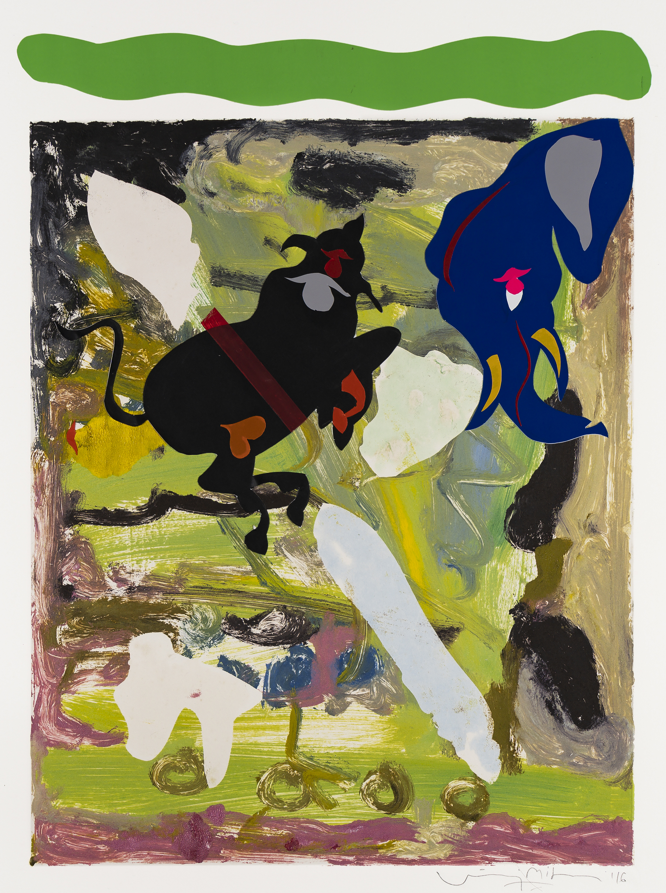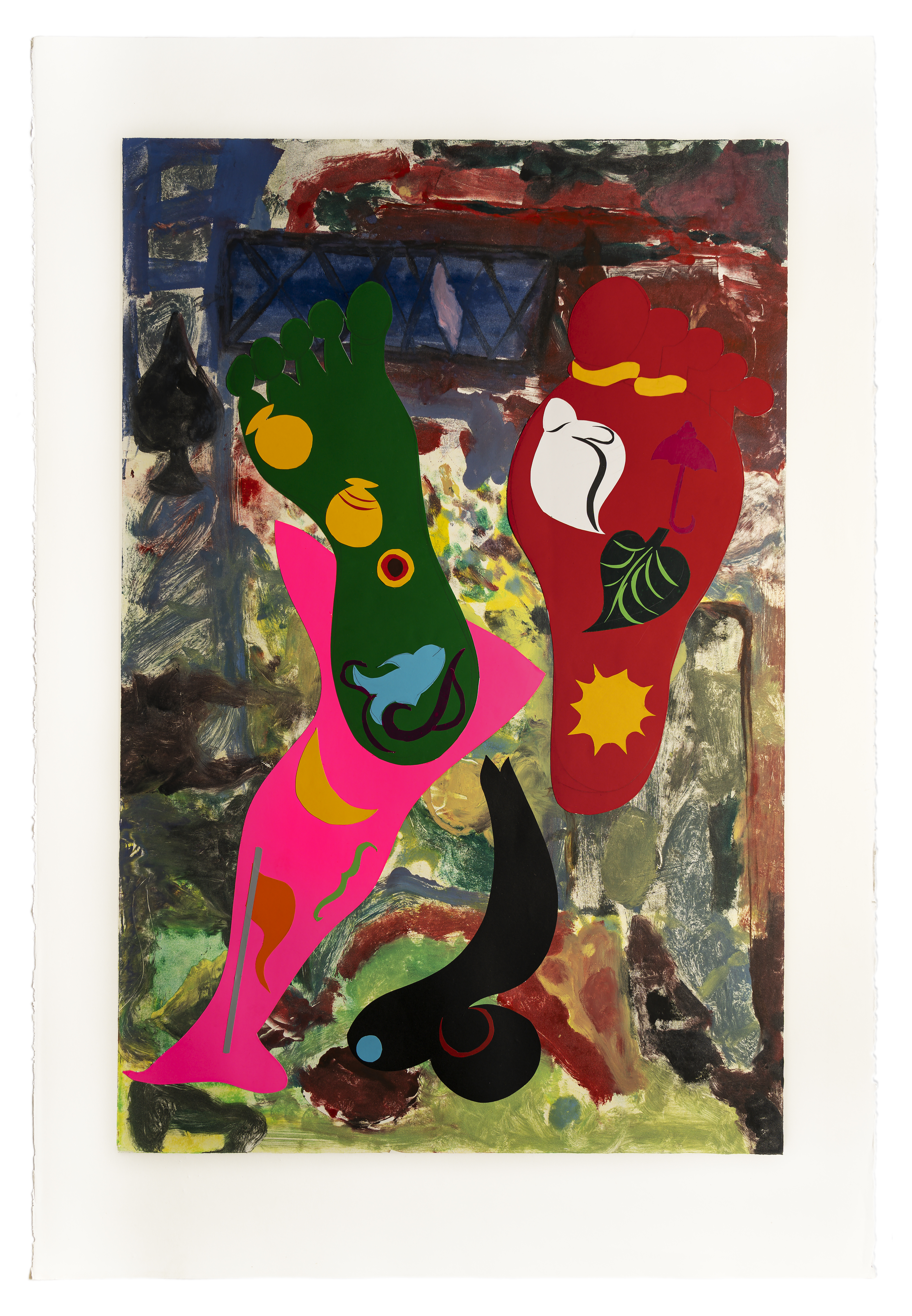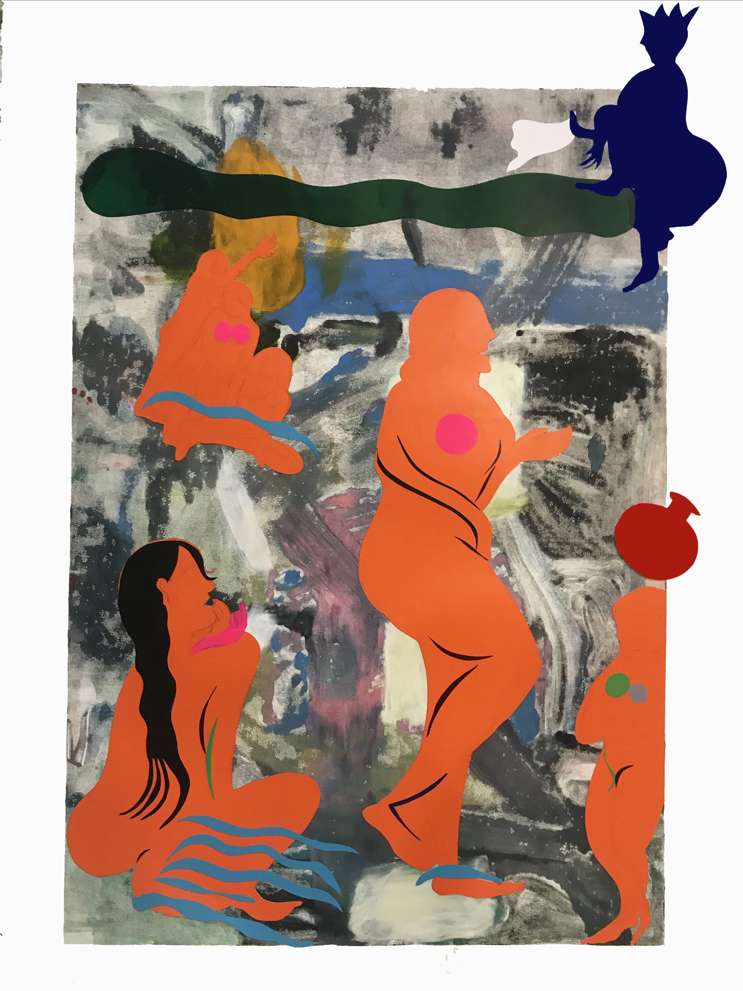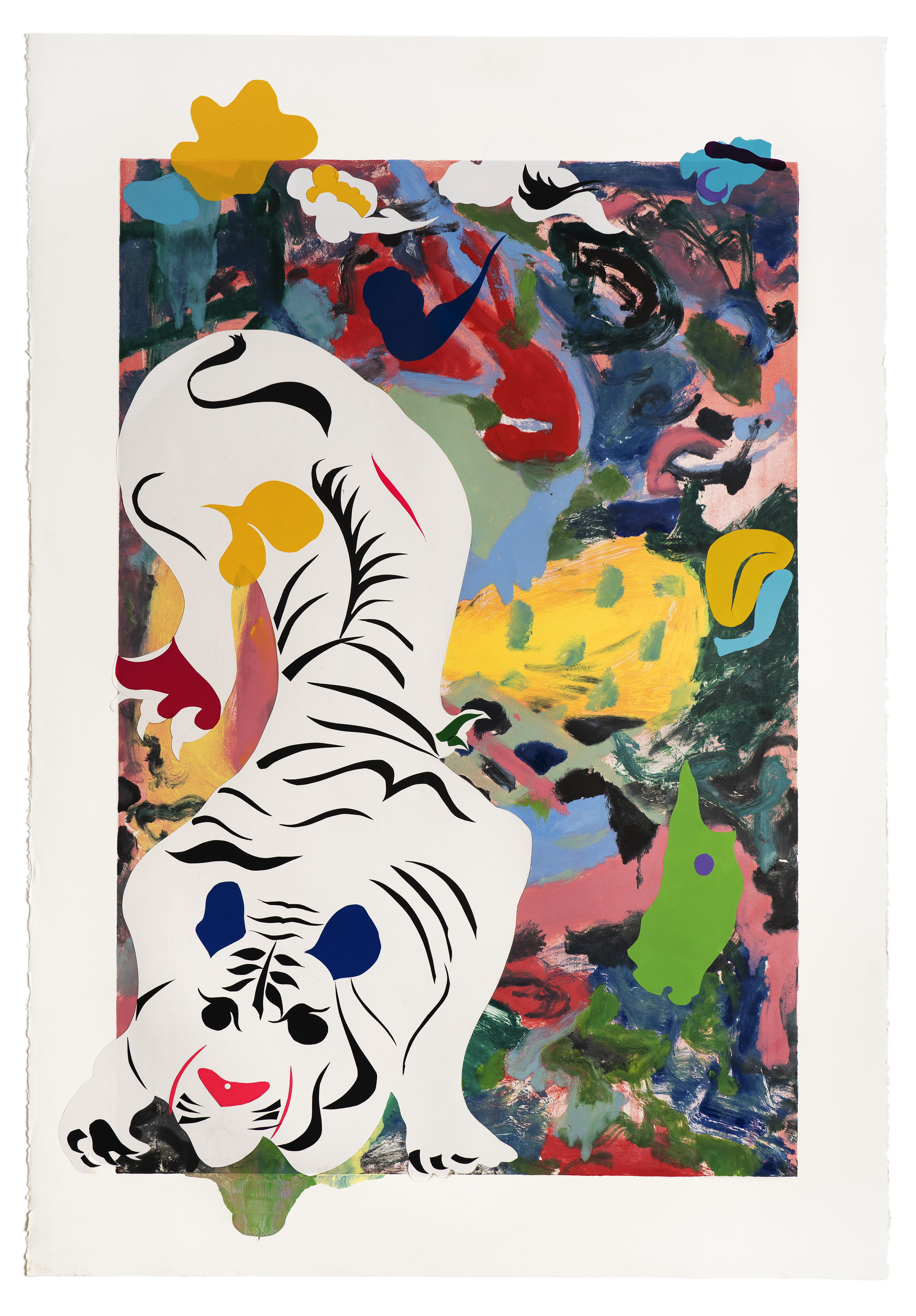 Raz and Mithani capitalise on a bold colour palette and processes of layering to produce a body of work that might be two-dimensional in nature, yet evokes a sense of fluidity and momentum. On one hand Mithani stylistically revives motifs and tales through representation, his body of work can be read like leaflets of a book where narratives come alive. On the other hand, Raz rejects narratives and playfully toys with semiotics, leaving hidden meanings, metaphors and symbols through her work. Familiar visual associations with 'traditional India' boomerang in front of us, but will we be able to place them?